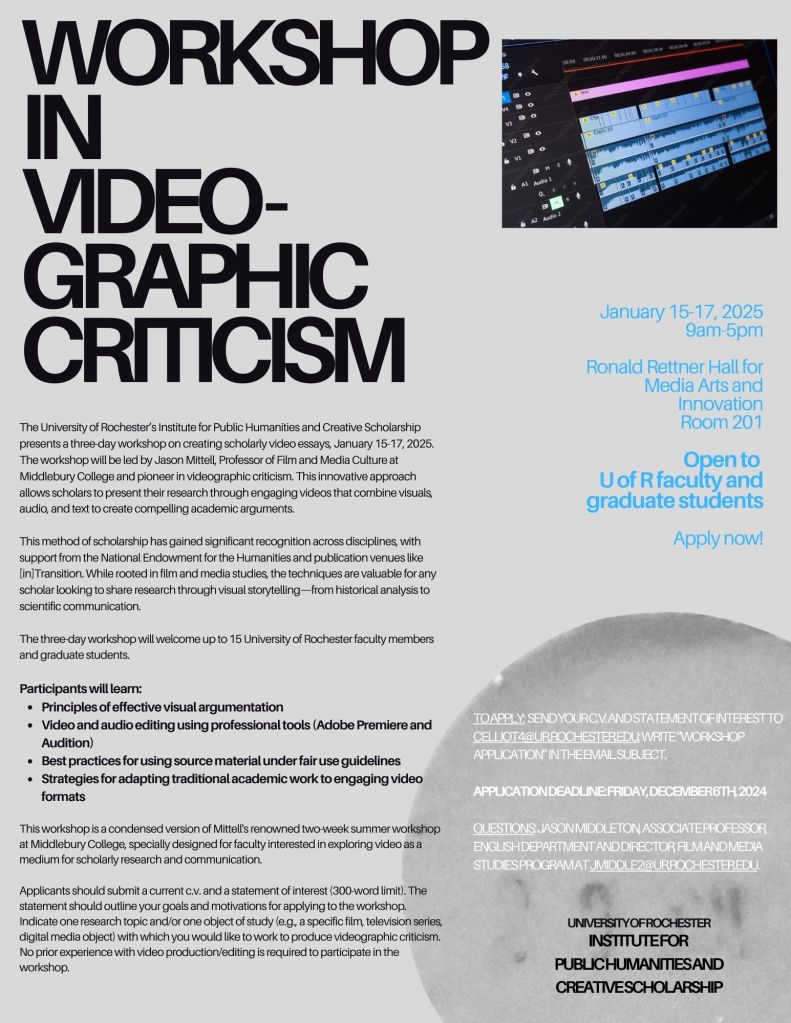 Jason Middleton organized a three-day workshop on creating scholarly video essays, led by Jason Mittell, Professor of Film and Media Culture at Middlebury College and a pioneer in videographic criticism. Videographic criticism is an innovative and growing mode of academic work that allows scholars to present their research through engaging videos that combine visuals, audio, and text to create compelling analysis and arguments. This method of scholarship has gained significant recognition across disciplines, with support from the National Endowment for the Humanities and publication venues like [in]Transition. While rooted in film and media studies, the techniques are valuable for any scholar looking to share research through visual storytelling—from historical analysis to scientific communication.